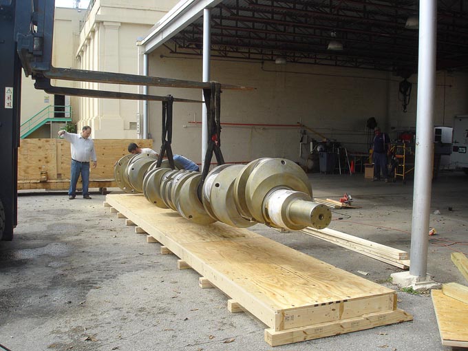 Another heavyweight project was the 23,000-pound, 35-foot crankshaft shown at right. Though shorter and lighter than the propeller shaft, it posed its own set of challenges. With cranks offset at different angles, it was neither as straight as the propeller shaft, nor as symmetrical. When we custom-designed its ultra-heavy-duty crate, we had to make special provision for its weight distribution, balance, and center of gravity, then block and band the shaft to keep it in place.